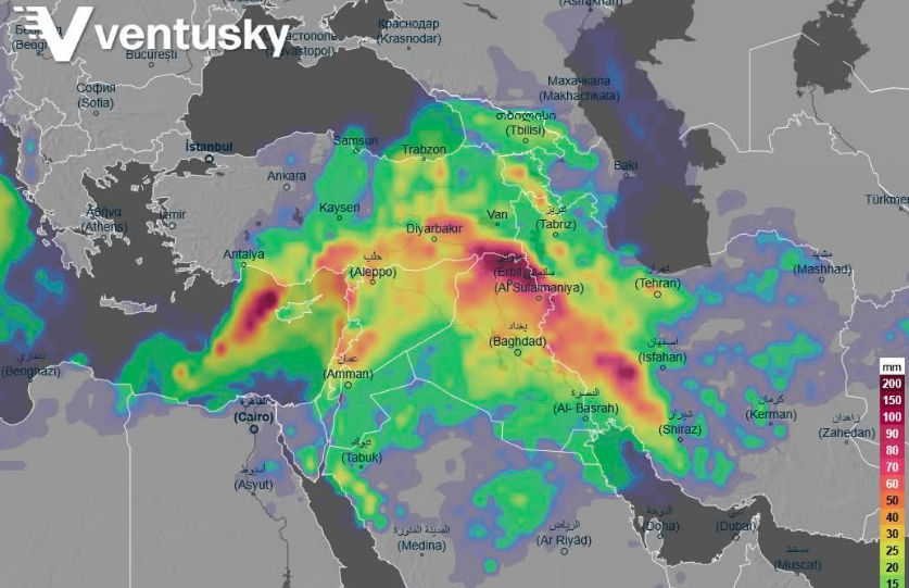 Rrebeshe lokale priten edhe në veriperëndim të Arabisë Saudite por me kalimin e sistemeve të vranësirave në Irak ato do të fuqizohen duke kushtëzuar rrebeshe të fuqishme shiu me vetëtima dhe bubullimë. Pastaj nga Iraku këto reshje do të kalojnë edhe në territorin e Iranit.